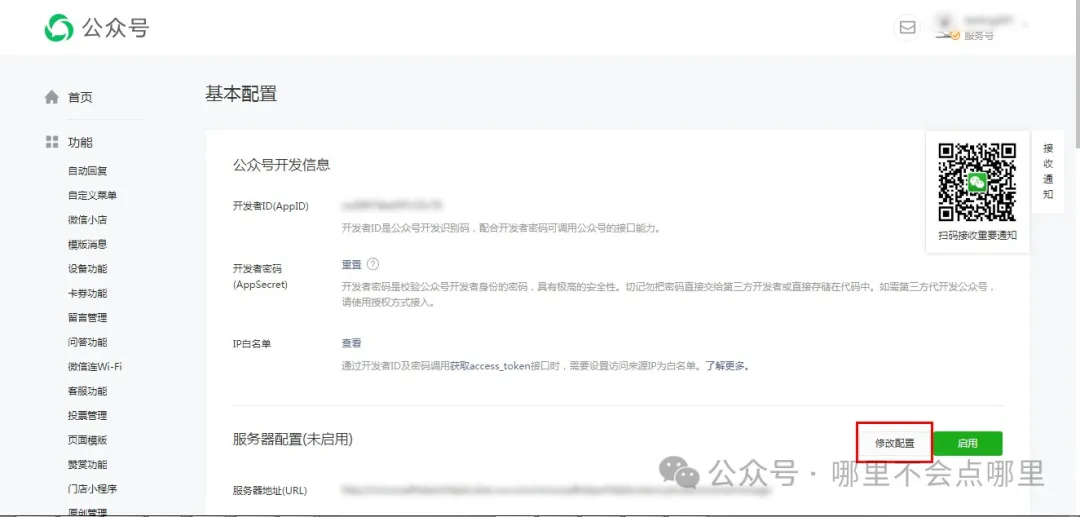 登录公众号后台,访问 设置与开发>基本配置,启用开发者,并走账号登录认证流程获取AppSecret,注意保存AppSecret。
