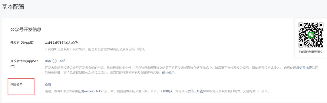 这一步配置IP白名单,是为了插件访问公众号openapi接口能够正常访问设置的。通过访问 https://www.whatismyip.com/ 获取本机的公网IP,或者在插件中配置好appID和appSecret后尝试上传图片,并观察网络请求的报错,从报错中就可以得知被拒绝访问的IP地址,即是我们的公网IP地址。