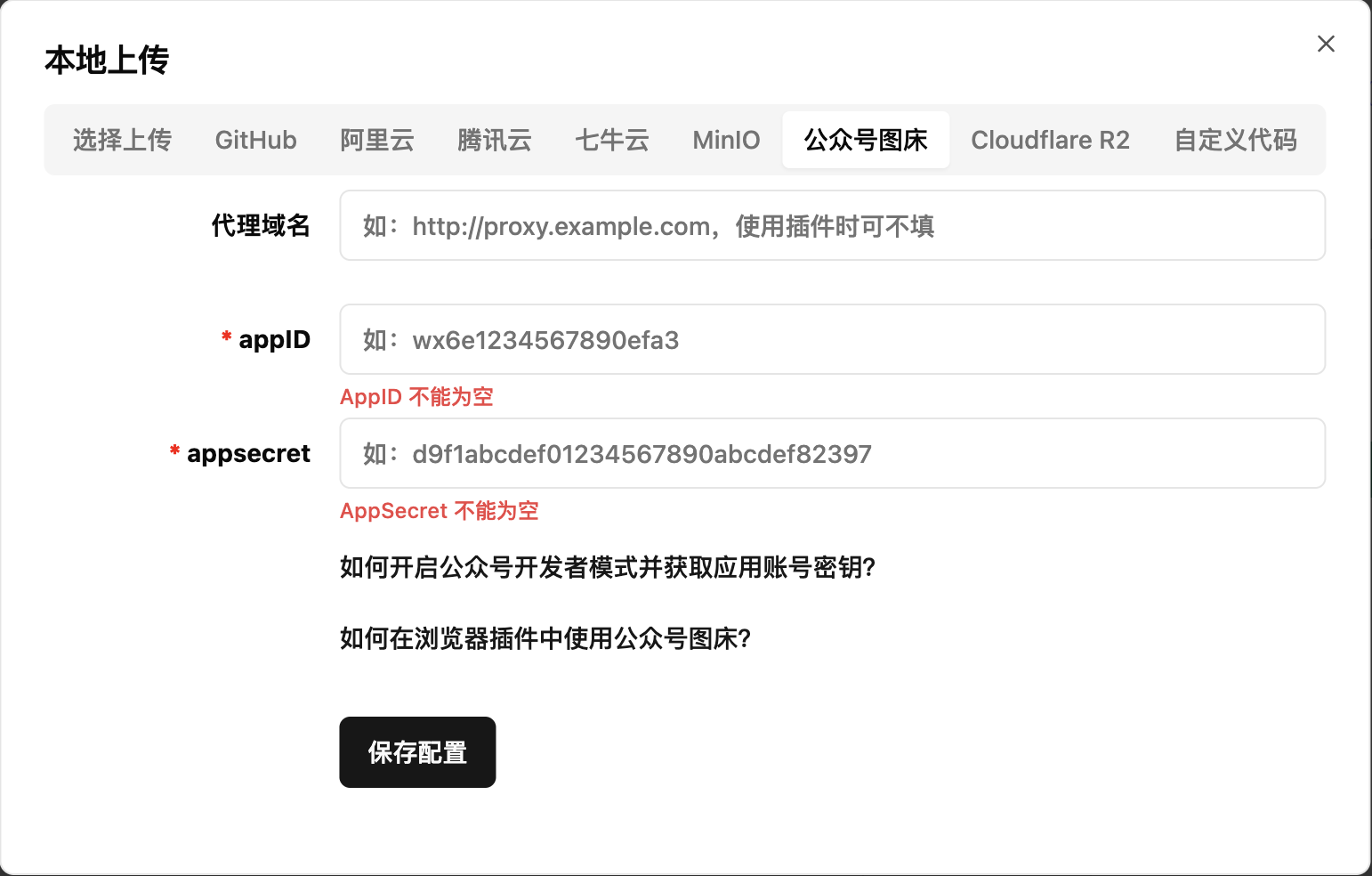 右键弹出菜单,选择上传图片,然后选择公众号图床tab,填入账号密钥(只有web版本才需要代理域名)