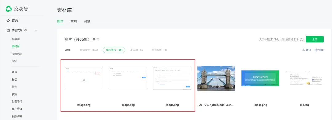 图片内容是保存到微信公众号后台的素材库默认分组的